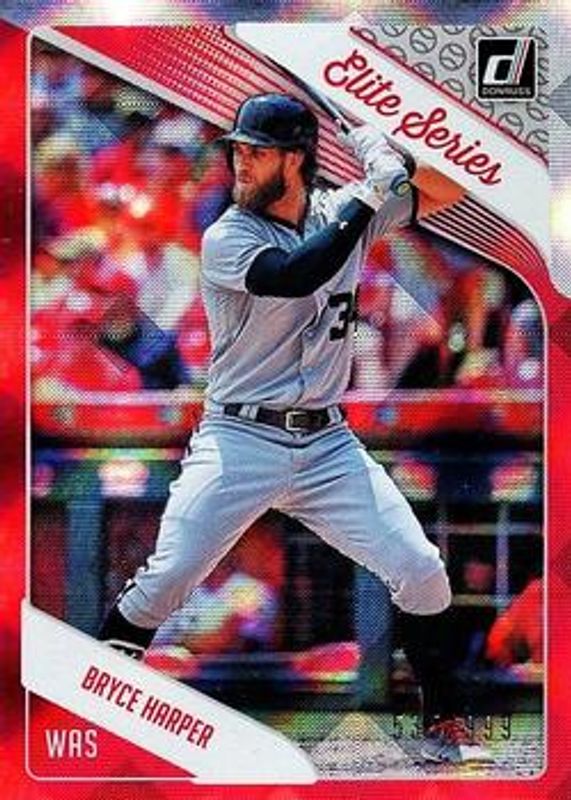 The Bryce Harper 2018 Donruss #ES3 Elite Series /999 card is 1 of 34 Bryce Harper's card variations in the 2018 Donruss set being tracked by Sports Card Investor, including #270 Base, Blank Back, Diamond Kings - Blank Back, #192 Holo Blue, and #270 Holo Blue.