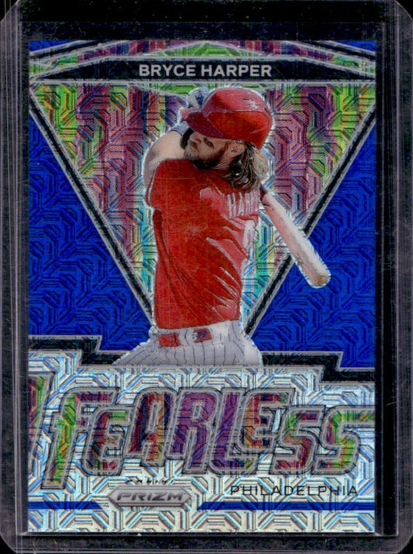 The Bryce Harper 2021 Prizm #FR-11 Fearless - Blue Mojo /199 card is 1 of 88 Bryce Harper's card variations in the 2021 Prizm set being tracked by Sports Card Investor, including Base, Blue, Blue Velocity, Carolina Blue, and Cosmic Haze.