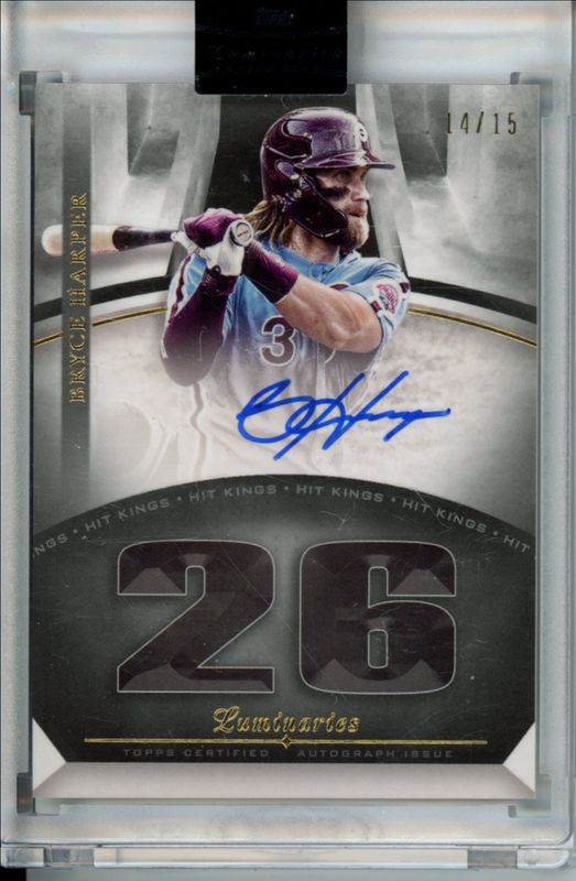 The Bryce Harper 2021 Topps Luminaries #HK-BH Hit Kings Autographs /15 card is 1 of 23 Bryce Harper's card variations in the 2021 Topps Luminaries set being tracked by Sports Card Investor, including Hit Kings Autographs Patches /15, Hit Kings Autographs Relics /15, Home Run Autographs Patches /15, Home Run Autographs Relics /15, and Home Run Kings Autographs /15.