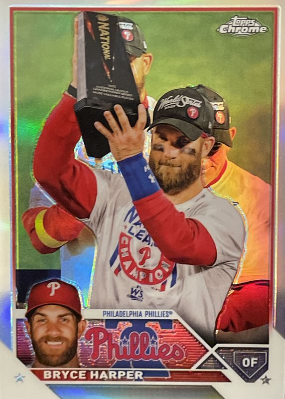 The Bryce Harper 2023 Topps Chrome #3 SP Variation (Holding Trophy) card in Raw condition has moved up $10.00 (+40.0%) in the last 30 days and was last sold for $34.99 .