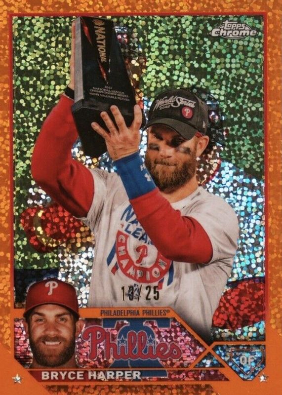 Bryce Harper 2023 Topps Chrome #3 SP Variation - Orange Speckle Refractor /25 (Holding Trophy) RAW Price Guide