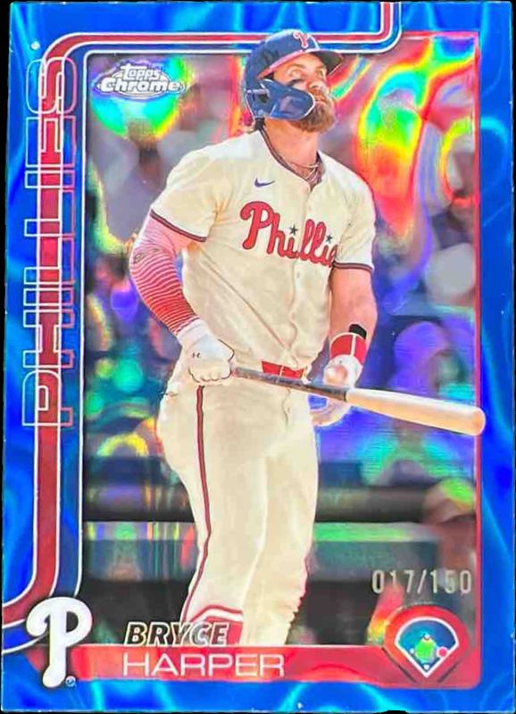 The Bryce Harper 2025 Topps Chrome #150 Blue RayWave Refractor /150 card is 1 of 113 Bryce Harper's card variations in the 2025 Topps Chrome set being tracked by Sports Card Investor, including Base, Geometric Refractor, Image Variation, Lightboard Logo Variation, and Negative Refractor.