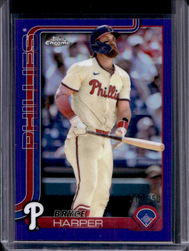 The Bryce Harper 2025 Topps Chrome #150 Purple Refractor /250 card is 1 of 113 Bryce Harper's card variations in the 2025 Topps Chrome set being tracked by Sports Card Investor, including Base, Geometric Refractor, Image Variation, Lightboard Logo Variation, and Negative Refractor.
