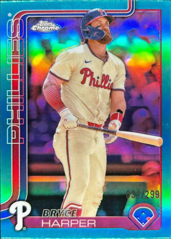 The Bryce Harper 2025 Topps Chrome #150 Teal Refractor /299 card is 1 of 113 Bryce Harper's card variations in the 2025 Topps Chrome set being tracked by Sports Card Investor, including Base, Geometric Refractor, Image Variation, Lightboard Logo Variation, and Negative Refractor.