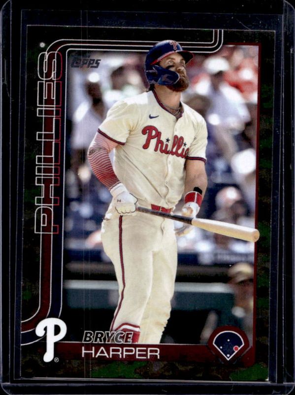 The Bryce Harper 2025 Topps #250 Memorial Day Camo /25 card is 1 of 298 Bryce Harper's card variations in the 2025 Topps set being tracked by Sports Card Investor, including Base, Aqua Holo Foil, Diamante Foil, Holo Foil, and Pink Diamante Foil.