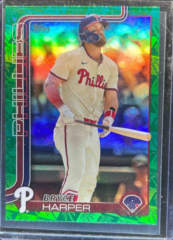 The Bryce Harper 2025 Topps #250 Spring Training Green Foilboard /99 card is 1 of 298 Bryce Harper's card variations in the 2025 Topps set being tracked by Sports Card Investor, including Base, Aqua Holo Foil, Diamante Foil, Holo Foil, and Pink Diamante Foil.