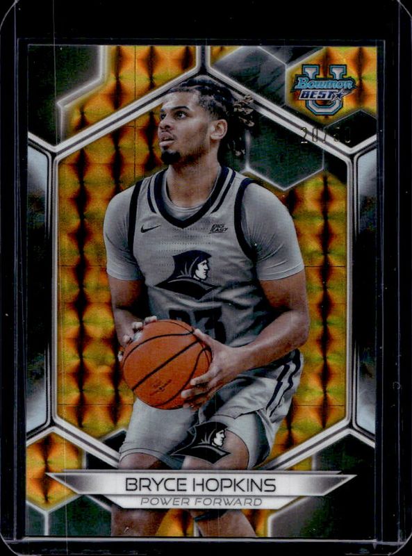 The Bryce Hopkins 2023 Bowman Best University #72 Geometric Gold Refractor /50 card is 1 of 27 Bryce Hopkins' card variations in the 2023 Bowman Best University set being tracked by Sports Card Investor, including Base, Refractor, Speckle Refractor, Blue Refractor /150, and Pink Lava Refractor /100.