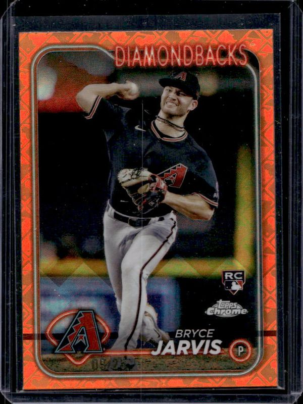 The Bryce Jarvis 2024 Topps Chrome Logofractor Edition #75 Orange /25 Rookie card is 1 of 10 Bryce Jarvis' card variations in the 2024 Topps Chrome Logofractor Edition set being tracked by Sports Card Investor, including Base, Purple /250, Aqua /199, Blue /150, and Green /99.