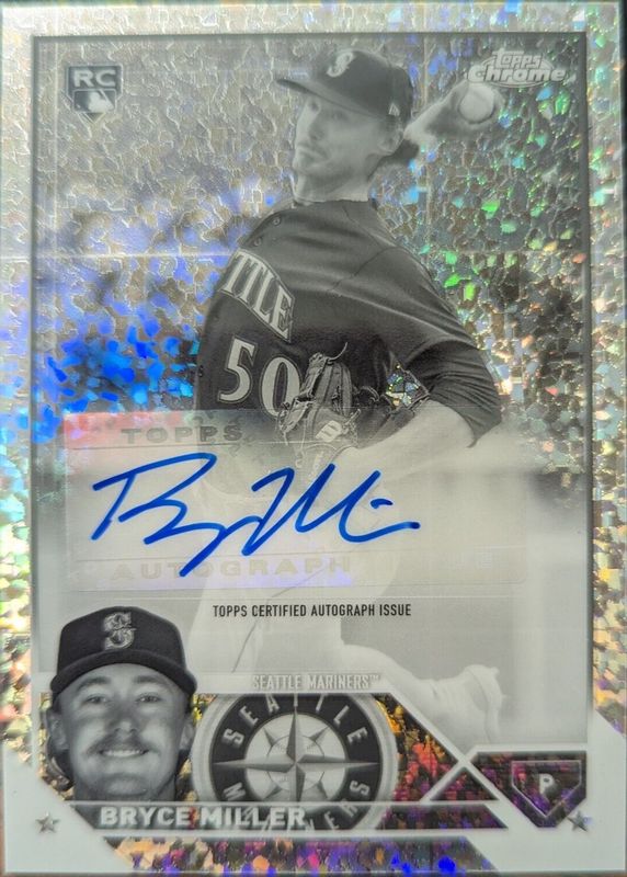 This card is 1 of 17 Bryce Miller's card variations in the 2023 Topps Chrome Update set being tracked by Sports Card Investor, including Autographs, Autographs - Refractor /499, Autographs - Purple Speckle Refractor /299, Autographs - Purple Refractor /250, and Autographs - Aqua Wave Refractor /199.