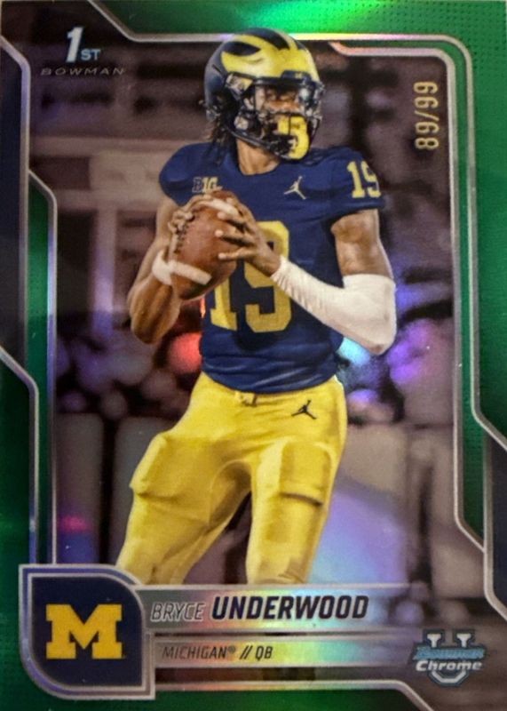 The Bryce Underwood 2025 Bowman Chrome University #196 Green Refractor /99 (1st) card in Raw condition has moved up $8.42 (+31.7%) in the last 30 days and was last sold for $35.00 .