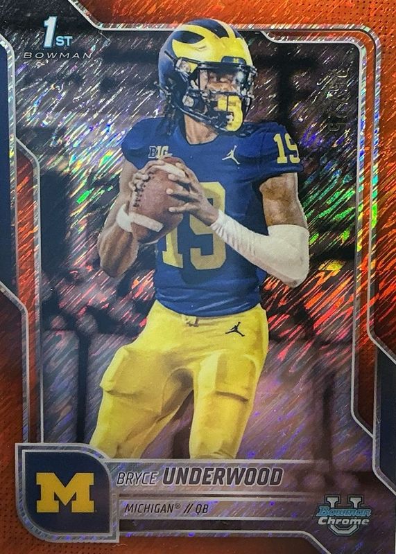 The Bryce Underwood 2025 Bowman Chrome University #196 Orange Shimmer Refractor /25 (1st) card in Raw condition has not changed in price in the last 30 days and was last sold for $67.67 .