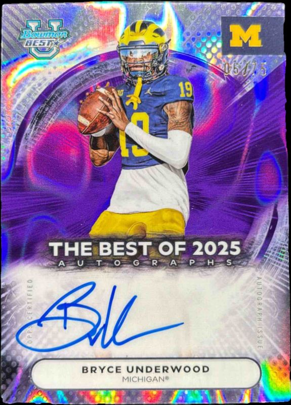 The Bryce Underwood 2025 Bowman's Best #BOA-BU The Best of 2025 Autographs - Purple Lava Refractor /75 card is 1 of 89 Bryce Underwood's card variations in the 2025 Bowman's Best set being tracked by Sports Card Investor, including Base, Refractor, Shimmer Refractor, Yellow Lazer Refractor /250, and Aqua Lava Refractor /199.