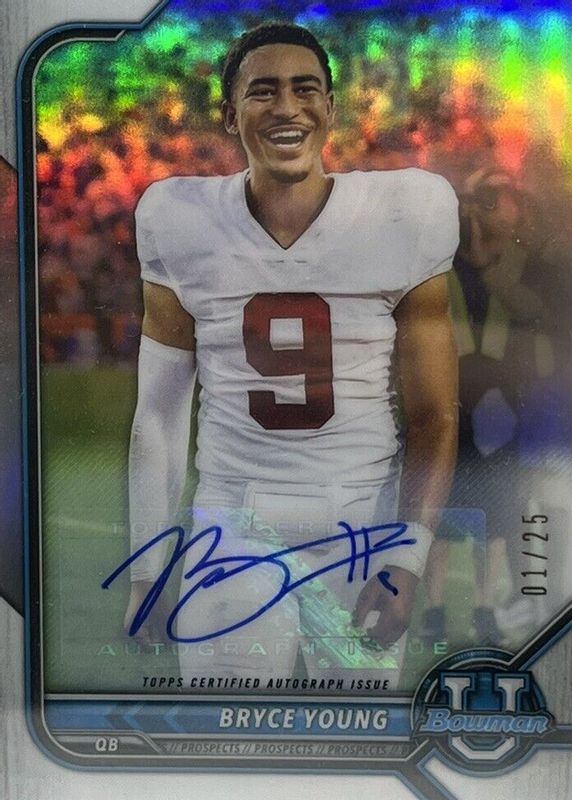 This card is 1 of 33 Bryce Young's card variations in the 2021 Bowman University set being tracked by Sports Card Investor, including Paper Prospects (1st), Chrome Prospects - Pink Refractor (1st), Chrome Prospects - Purple Refractor (1st), Chrome Prospects - Refractor (1st), and Chrome Prospects - Shimmer Refractor (1st).