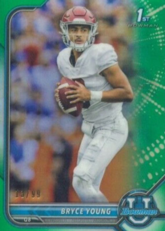 The Bryce Young 2021 Bowman University #4 Chrome Prospects - Green Refractor /99 (1st) card in Raw condition has not changed in price in the last 30 days and was last sold for $13.29 .