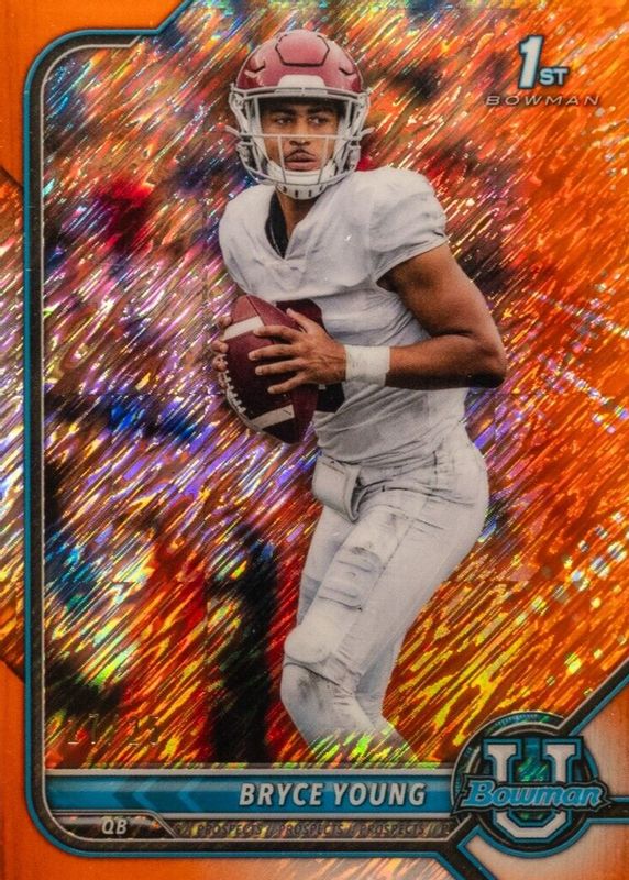 This card is 1 of 33 Bryce Young's card variations in the 2021 Bowman University set being tracked by Sports Card Investor, including Paper Prospects (1st), Chrome Prospects - Pink Refractor (1st), Chrome Prospects - Purple Refractor (1st), Chrome Prospects - Refractor (1st), and Chrome Prospects - Shimmer Refractor (1st).