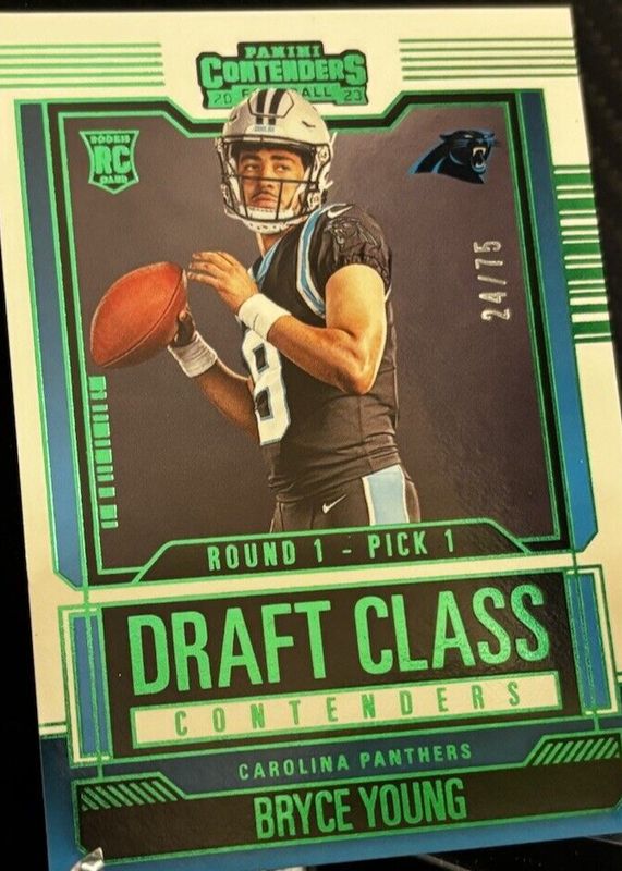 The Bryce Young 2023 Contenders #3 Draft Class Contenders - Green /75 Rookie card in Raw condition has not changed in price in the last 30 days and was last sold for $3.00 .