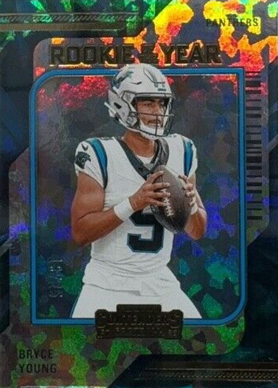 The Bryce Young 2023 Contenders #4 Rookie of the Year Contenders - Cracked Ice /25 card in Raw condition has not changed in price in the last 30 days and was last sold for $60.00 .
