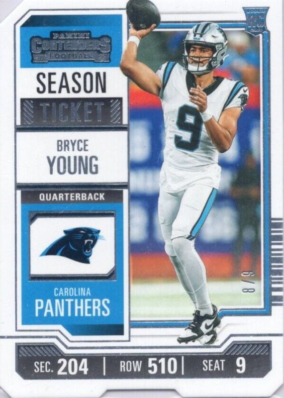 The Bryce Young 2023 Contenders #15 Ticket Stub (/9) Rookie card in Raw condition has not changed in price in the last 30 days and was last sold for $39.00 .