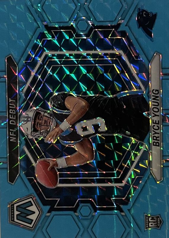 The Bryce Young 2023 Mosaic #ND-2 NFL Debut - Blue Fluorescent /15 Rookie card in Raw condition has not changed in price in the last 30 days and was last sold for $199.99 .