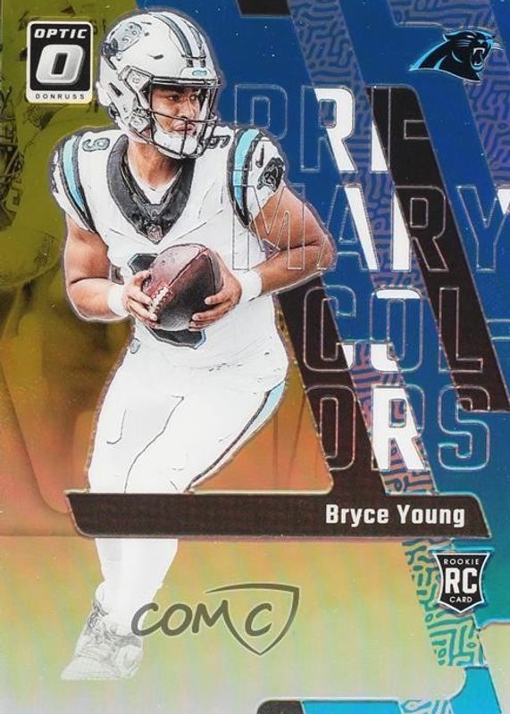 The Bryce Young 2023 Optic #3 Rookie Primary Colors - Gold /10 card in Raw condition has not changed in price in the last 30 days and was last sold for $125.42 .