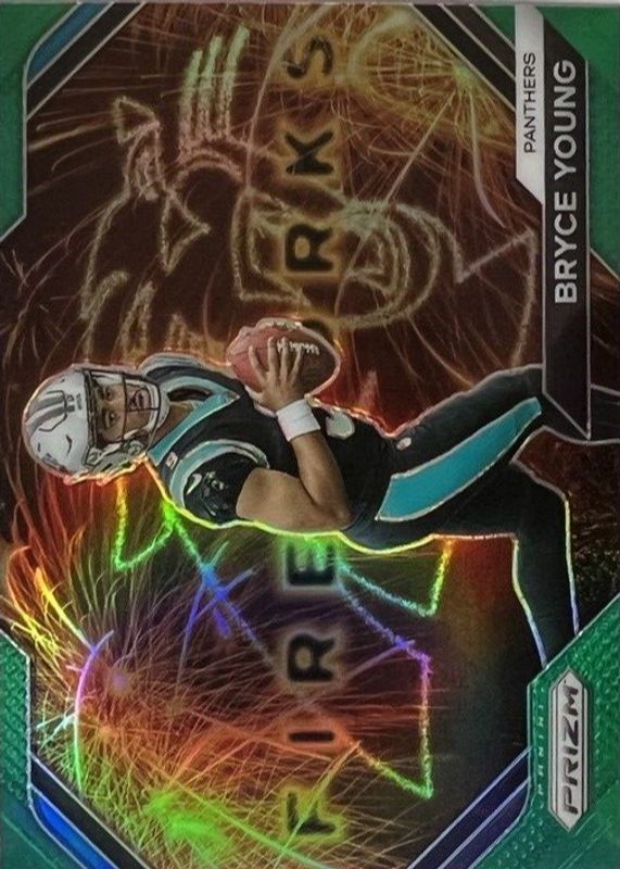 The Bryce Young 2023 Prizm #F-6 Fireworks - Green Rookie card in Raw condition has moved up $0.26 (+26.3%) in the last 30 days and was last sold for $1.25 .