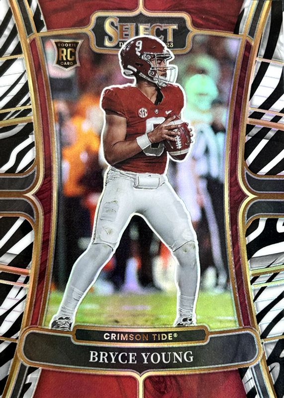 The Bryce Young 2023 Select Draft Picks #1 Concourse Zebra /(SSP) Rookie card in Raw condition has not changed in price in the last 30 days and was last sold for $69.00 .