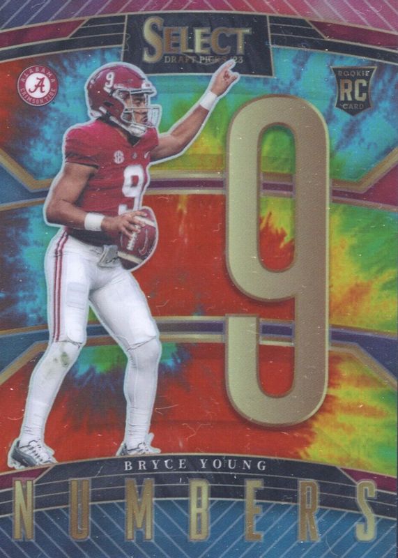 The Bryce Young 2023 Select Draft Picks #SN-BY Select Numbers - Tie-Dye /25 Rookie card in Raw condition has not changed in price in the last 30 days and was last sold for $29.99 .