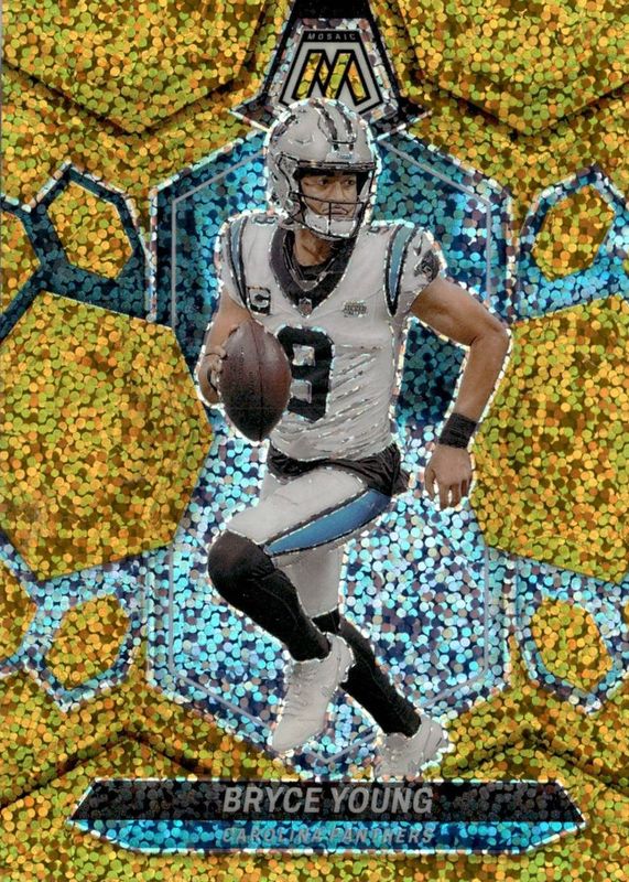 This card is 1 of 31 Bryce Young's card variations in the 2024 Mosaic set being tracked by Sports Card Investor, including Orange /199, Blue /99, Blue Sparkle /96, Choice Fusion Red & Yellow /80, and No Huddle Blue /75.