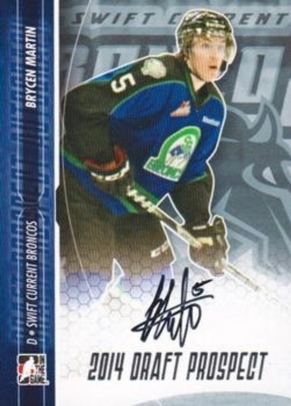The Brycen Martin 2014 In The Game Draft Prospects #A-BMA2 Autographs card is 1 of 24 Brycen Martin's card variations in the 2014 In The Game Draft Prospects set being tracked by Sports Card Investor, including Base, Bronze /25, Silver /10, Gold /1, and Printing Plates Black /1.