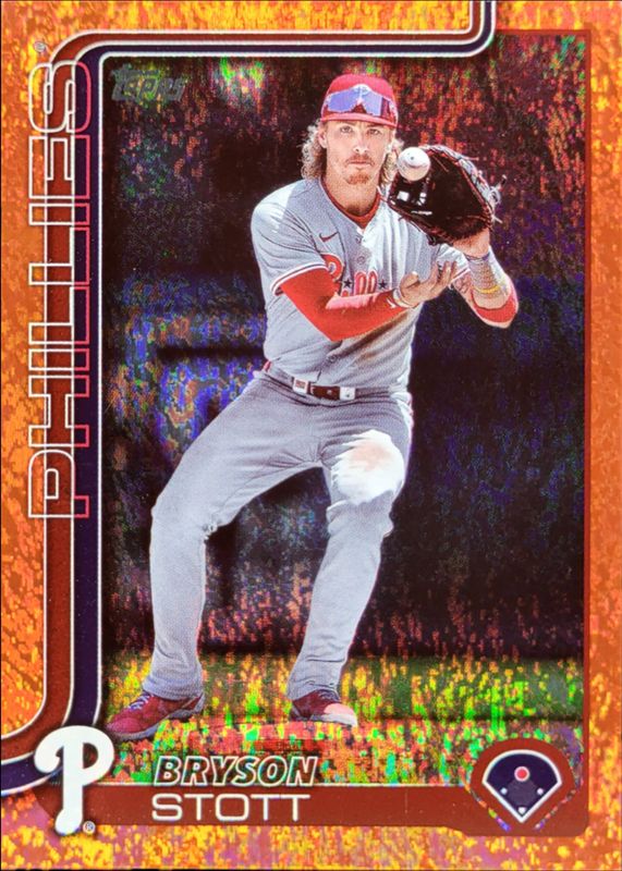 The Bryson Stott 2025 Topps #147 Orange Diamante Foil /25 card is 1 of 103 Bryson Stott's card variations in the 2025 Topps set being tracked by Sports Card Investor, including Base, Aqua Holo Foil, Diamante Foil, Holo Foil, and Pink Diamante Foil.