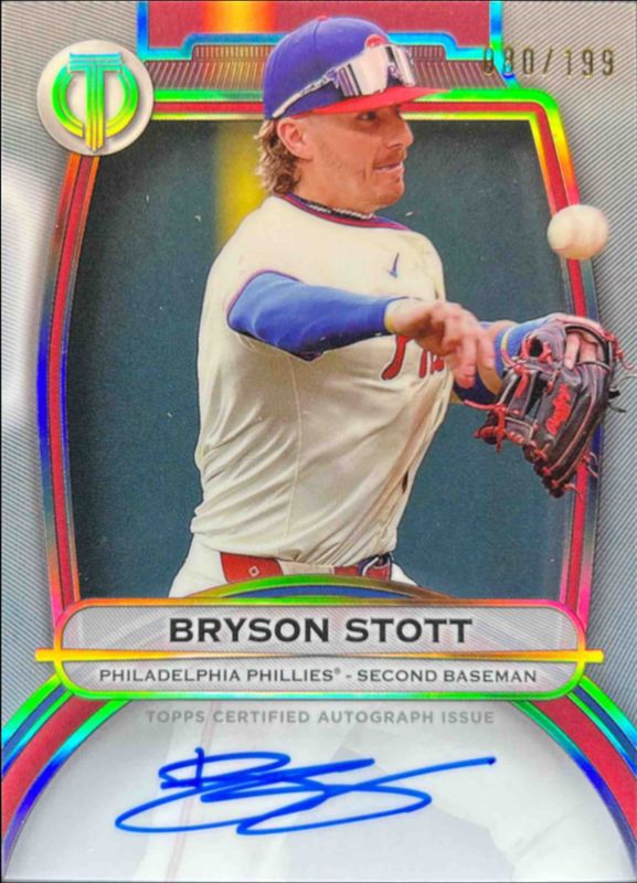 The Bryson Stott 2025 Topps Tribute #TA-BS Tribute Autograph /199 card is 1 of 27 Bryson Stott's card variations in the 2025 Topps Tribute set being tracked by Sports Card Investor, including Stamp of Approval /199, Stamp of Approval - Blue /150, Tribute Autograph - Blue /150, Stamp of Approval - Green /99, and Tribute Autograph - Green /99.
