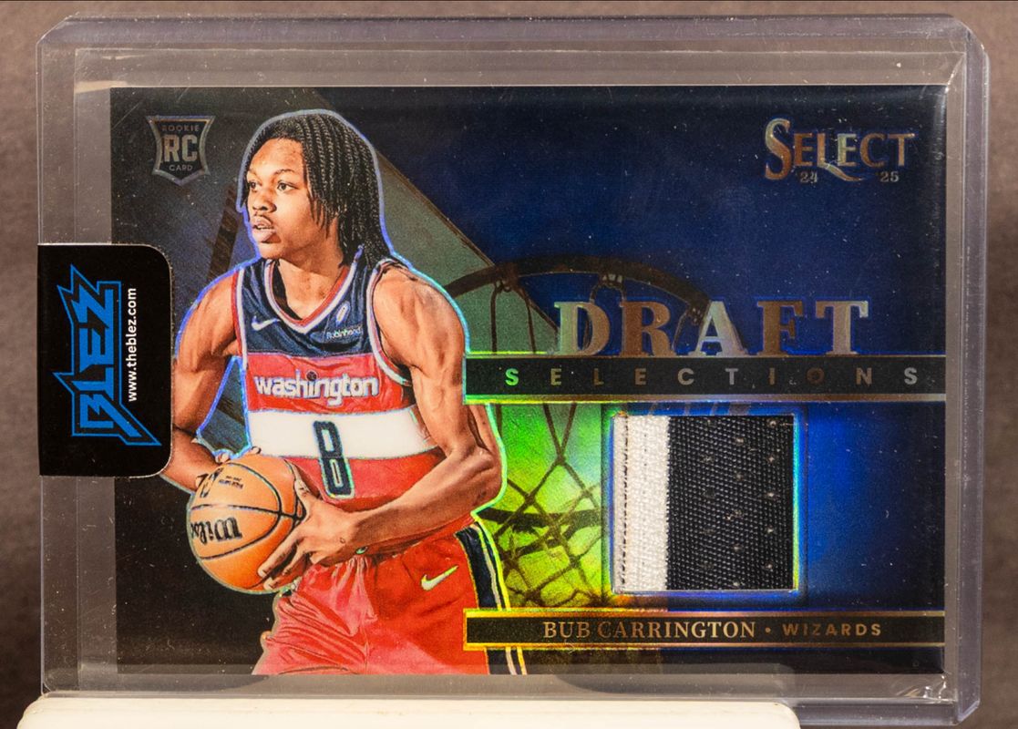 The Bub Carrington 2024 Select #DSM-BUB Draft Selections Memorabilia Blue /75 Rookie card is 1 of 352 Bub Carrington's card variations in the 2024 Select set being tracked by Sports Card Investor, including Concourse, Courtside, Mezzanine, Premier Level, and Concourse Blue Cracked Ice.