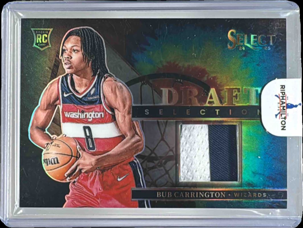 The Bub Carrington 2024 Select #DSM-BUB Draft Selections Memorabilia Tie-Dye /25 Rookie card is 1 of 352 Bub Carrington's card variations in the 2024 Select set being tracked by Sports Card Investor, including Concourse, Courtside, Mezzanine, Premier Level, and Concourse Blue Cracked Ice.