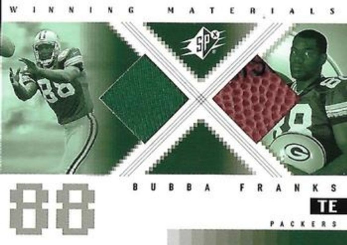 The Bubba Franks 2000 SPx #WM-DF Winning Materials Rookie card is 1 of 4 Bubba Franks' card variations in the 2000 SPx set being tracked by Sports Card Investor, including Base /1350, Spectrum /25, and SPxcitement.