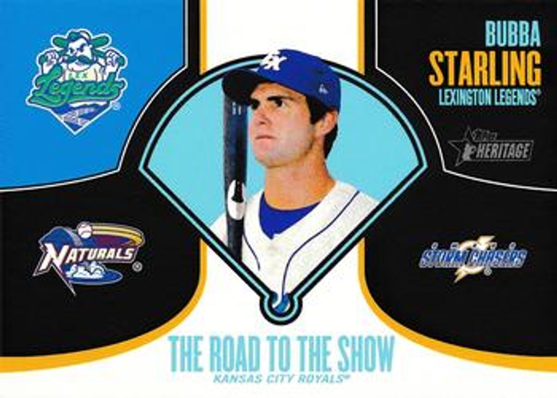 The Bubba Starling 2013 Topps Heritage Minor League #RTTS-BS Road to the Show card is 1 of 11 Bubba Starling's card variations in the 2013 Topps Heritage Minor League set being tracked by Sports Card Investor, including #216 Base, #216b Base, #216 Venezuelan, #216 Black /96, and #216 Blue /1.