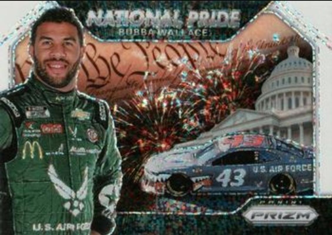 The Bubba Wallace 2020 Prizm NASCAR #NP3 National Pride - White Sparkle card is 1 of 114 Bubba Wallace's card variations in the 2020 Prizm NASCAR set being tracked by Sports Card Investor, including #15a Base, #15b Base, #67 Base, #80 Base, and #80 Blue.