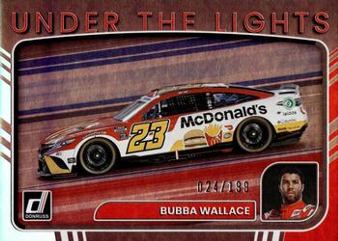 The Bubba Wallace 2023 Donruss NASCAR #UL5 Under The Lights Holographic /199 card is 1 of 125 Bubba Wallace's card variations in the 2023 Donruss NASCAR set being tracked by Sports Card Investor, including #60 Base, #145 Base, #18 Base, #125 Base, and #125 Carolina Blue.