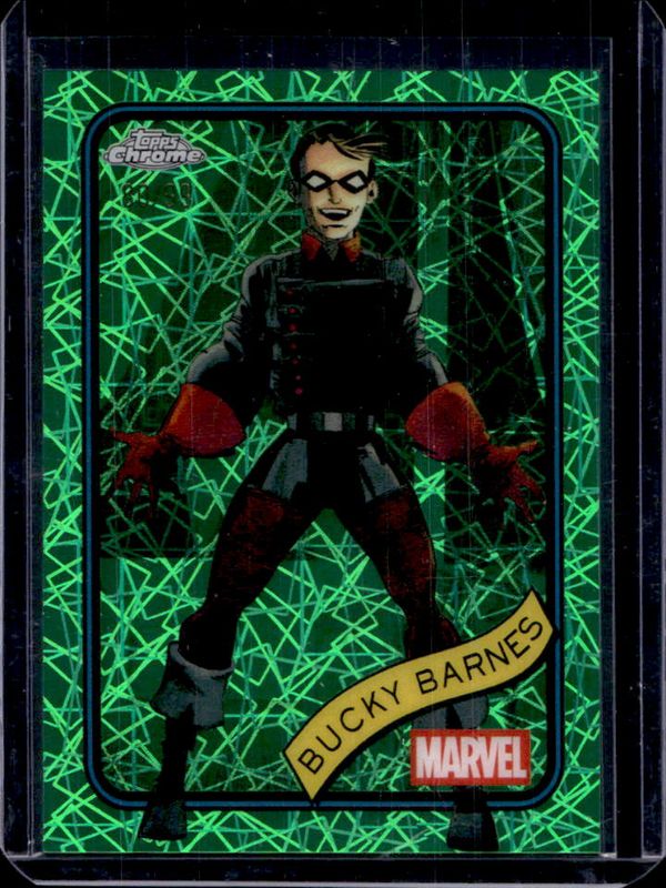 The Bucky Barnes 2025 Topps Chrome #124 Hulk Green Lazer Refractor /99 card is 1 of 23 Bucky Barnes' card variations in the 2025 Topps Chrome set being tracked by Sports Card Investor, including Base, Refractor, Yellow Lava Refractor, Spider Web Refractor /399, and Blue Refractor /299.