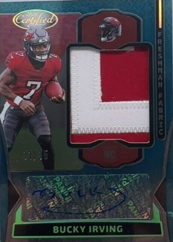 Bucky Irving 2024 Certified #FMS-BIG Freshman Fabric Signatures - Mirror Teal Etch /15 Rookie RAW Price Guide