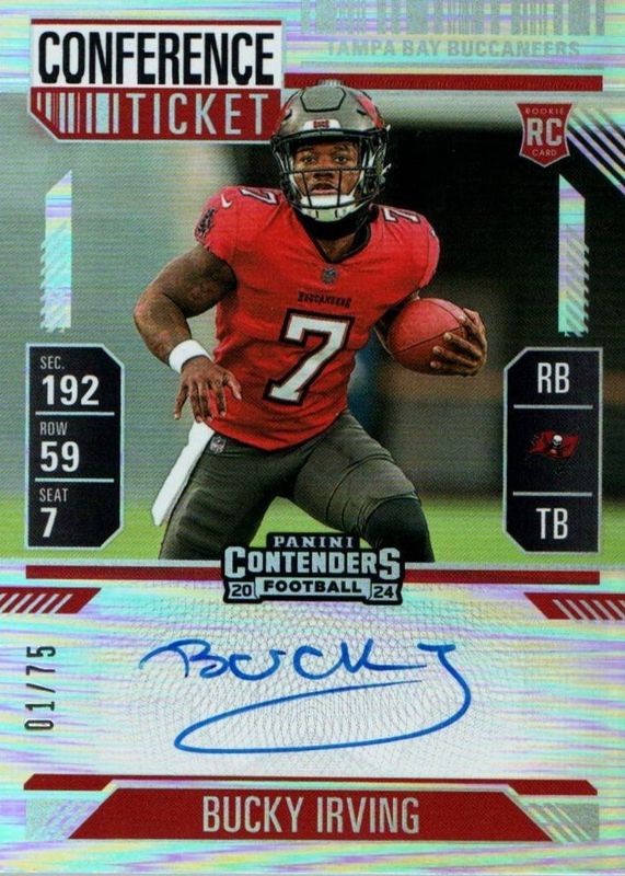 The Bucky Irving 2024 Contenders #122 Rookie Ticket Auto - Conference Ticket /75 card in Raw condition has not changed in price in the last 30 days and was last sold for $43.00 .