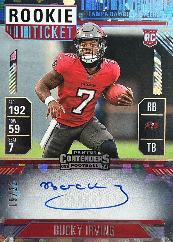 This card is 1 of 27 Bucky Irving's card variations in the 2024 Contenders set being tracked by Sports Card Investor, including Rookie Ticket Auto, Rookie Ticket Auto - Opening Kickoff Ticket, Rookie Ticket Auto - Red Zone Ticket, Rookie Ticket Auto - Ticket Stub (/7), and Rookie Ticket Auto Variation.