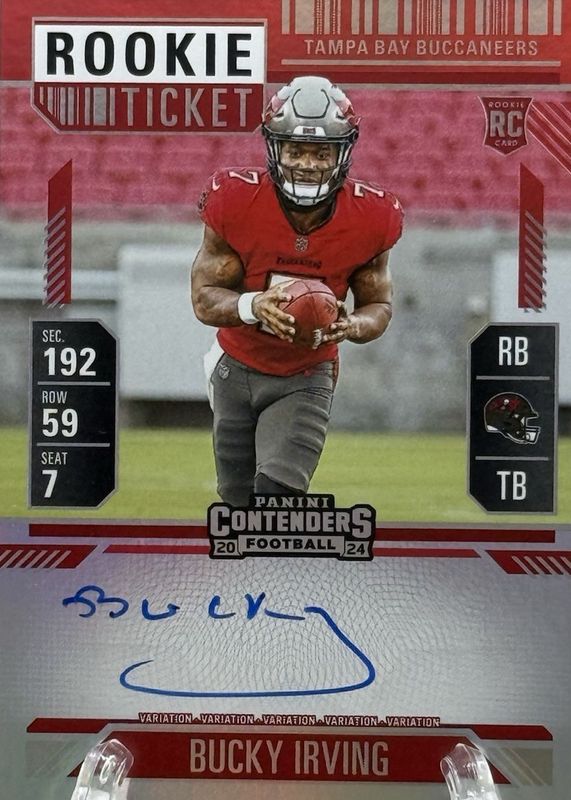 This card is 1 of 27 Bucky Irving's card variations in the 2024 Contenders set being tracked by Sports Card Investor, including Rookie Ticket Auto, Rookie Ticket Auto - Opening Kickoff Ticket, Rookie Ticket Auto - Red Zone Ticket, Rookie Ticket Auto - Ticket Stub (/7), and Rookie Ticket Auto Variation.