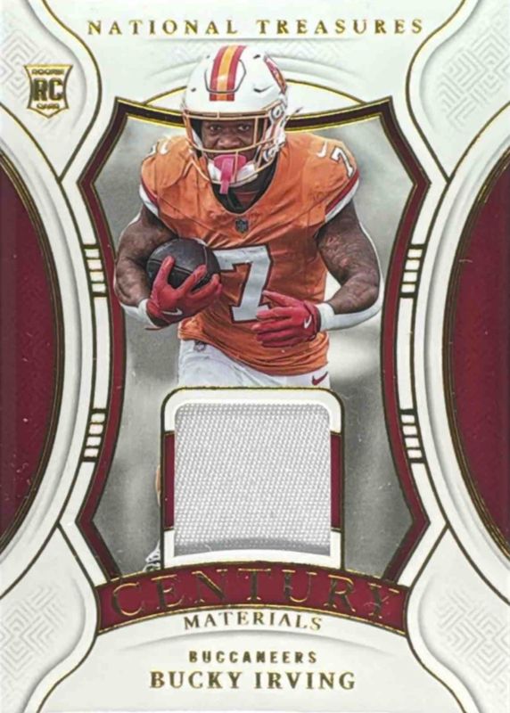 This card is 1 of 51 Bucky Irving's card variations in the 2024 National Treasures set being tracked by Sports Card Investor, including Rookie Dual Materials - Red Jersey Number (/7), Rookie Patch Auto - Green Jersey Number (/7), Century Materials /99, Rookie Dual Materials /99, and Rookie Patch Auto /99.
