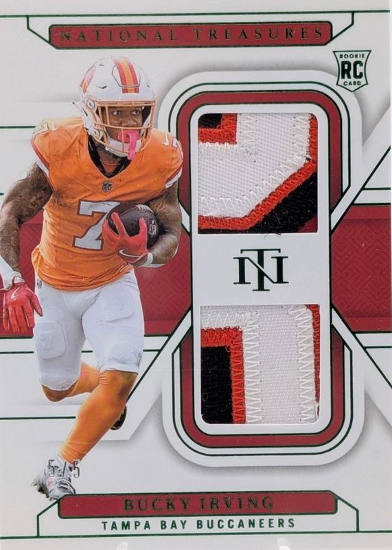 This card is 1 of 51 Bucky Irving's card variations in the 2024 National Treasures set being tracked by Sports Card Investor, including Rookie Dual Materials - Red Jersey Number (/7), Rookie Patch Auto - Green Jersey Number (/7), Century Materials /99, Rookie Dual Materials /99, and Rookie Patch Auto /99.