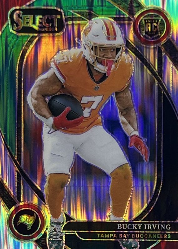This card is 1 of 164 Bucky Irving's card variations in the 2024 Select set being tracked by Sports Card Investor, including Club Level, Concourse, Field Level, Suite Level, and Club Level Black & Blue Shock.