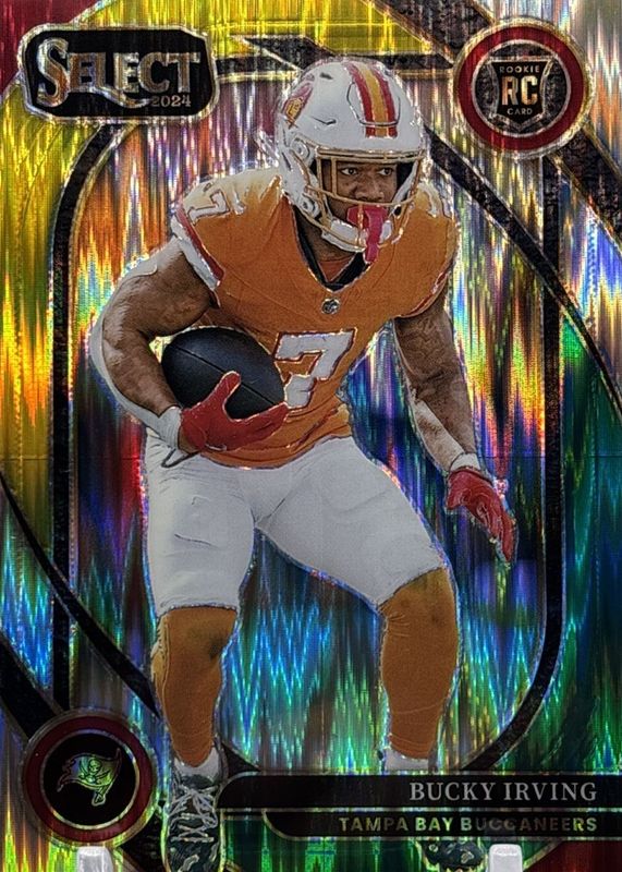 This card is 1 of 164 Bucky Irving's card variations in the 2024 Select set being tracked by Sports Card Investor, including Club Level, Concourse, Field Level, Suite Level, and Club Level Black & Blue Shock.