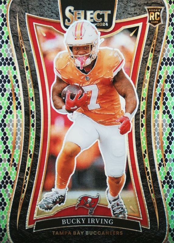 This card is 1 of 164 Bucky Irving's card variations in the 2024 Select set being tracked by Sports Card Investor, including Club Level, Concourse, Field Level, Suite Level, and Club Level Black & Blue Shock.