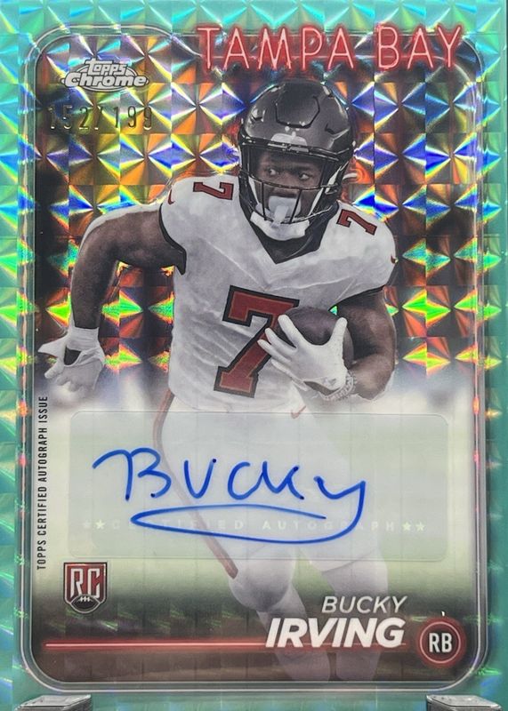 The Bucky Irving 2024 Topps Chrome #RA-BIR Rookie Auto - Aqua Sonar Refractor /199 card in Raw condition has moved up $3.87 (+16.8%) in the last 30 days and was last sold for $26.87 .