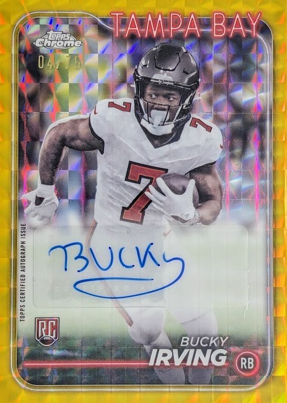 Auctions Ending Soon for Bucky Irving 2024 Topps Chrome #RA-BIR Rookie Auto - Yellow Geometric Refractor /75 RAW