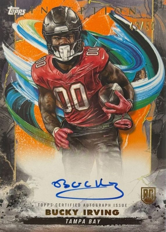 This card is 1 of 18 Bucky Irving's card variations in the 2024 Topps Inception set being tracked by Sports Card Investor, including Inaugurations, Rookie Autographs, Provenance Patch Autographs - Green /150, Rookie Autographs - Green /150, and Provenance Patch Autographs - Purple /125.